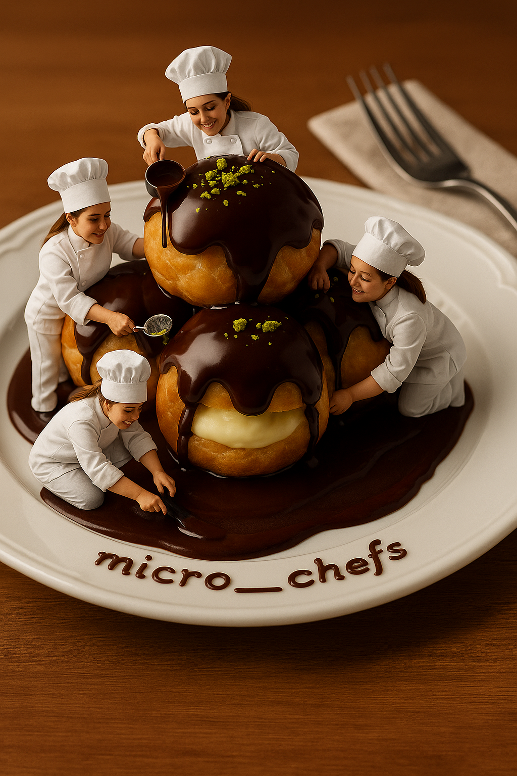 5-6 cm’lik güzel minyatür kadın şeflerimiz, profiterol tabaklarının üstünde ustalıkla çalışıyor: çikolata döken var, fıstık serpen var,...