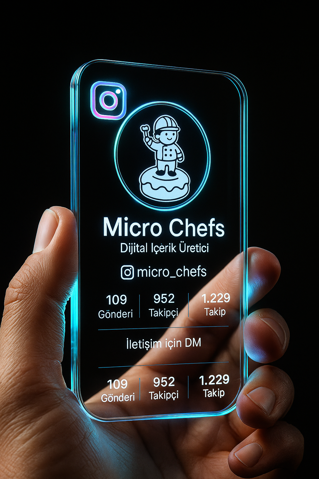 Ultra gerçekçi, yüksek çözünürlüklü 3D dijital bir görselleştirme oluştur. Görselde, baş parmak ve işaret parmağı arasında nazikçe tutulmakta olan futuristik bir Instagram profil kartı yer alsın. Kart, ışıklı, şeffaf camdan yapılmış olsun ve kenarlarında neon mavi ile turkuaz parıltılar bulunsun. Bu ışıklar parmakları hafifçe aydınlatsın ve zarif bir parıltı oluştursun. Arka plan düz siyah olsun, böylece kenarlardaki ışık efekti daha güçlü vurgulansın.